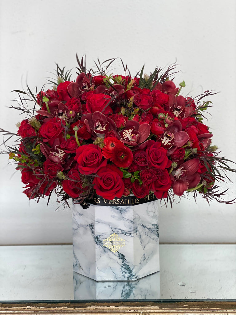 Designers choice mix of flowers in our medium sized hexagon box. Designer will choose what flowers to work base on the colors choose. Add pearls to box for additional $5.